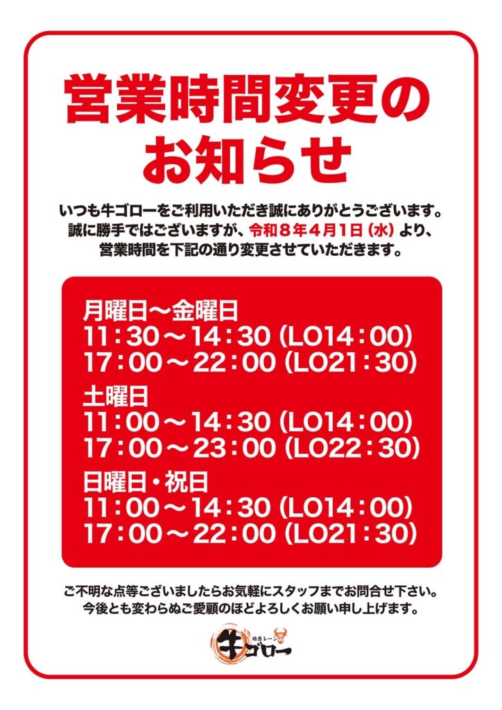 【公式】焼肉牛ゴローTOP > お知らせ > 営業時間変更のお知らせ 営業時間変更のお知らせ いつも当店のご利用いただき誠にありがとうございます。 誠に勝手ではございますが、4月から土日祝日の営業時間を変更させていただきます。 ご理解・ご確認の程よろしくお願いいたします。 2026.03.09 投稿先 お知らせ ← 過去の投稿へ